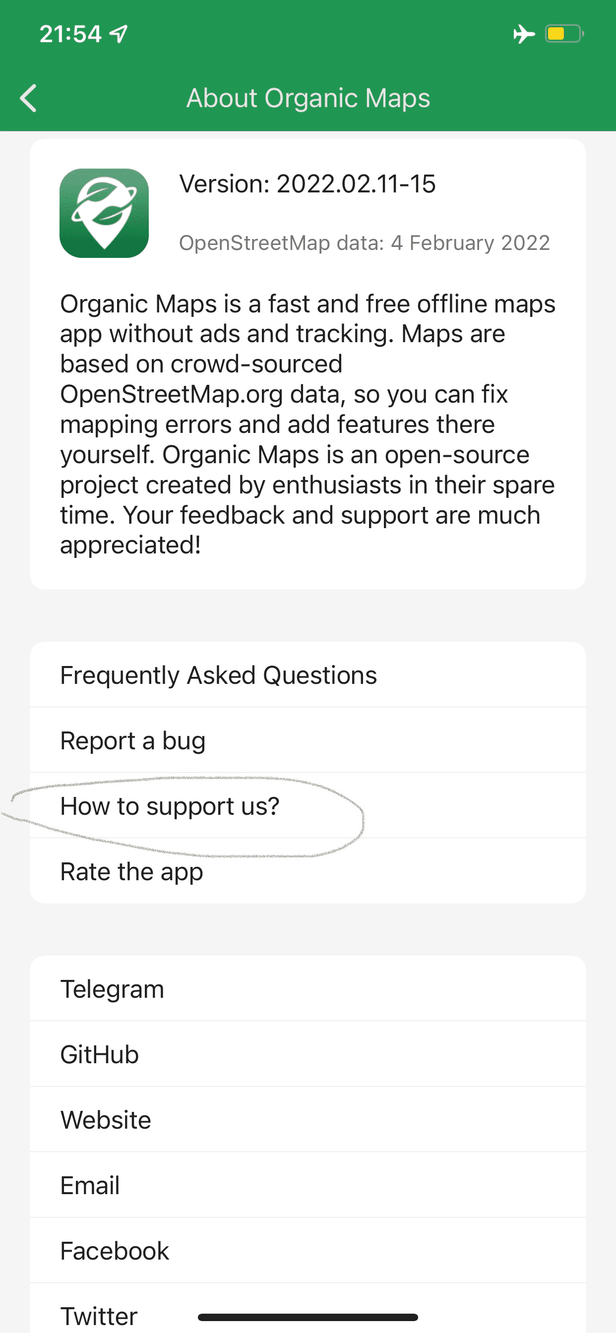ישנן דרכים רבות לעזור לנו ולמשתמשים אחרים ב-Organic Maps: https://organicmaps.app/support-us/ הפיצו את הבשורה ושתפו אותנו ברעיונות שלכם, בואו נהפוך את העולם הזה 🌎 לקצת יותר אורגני 😉